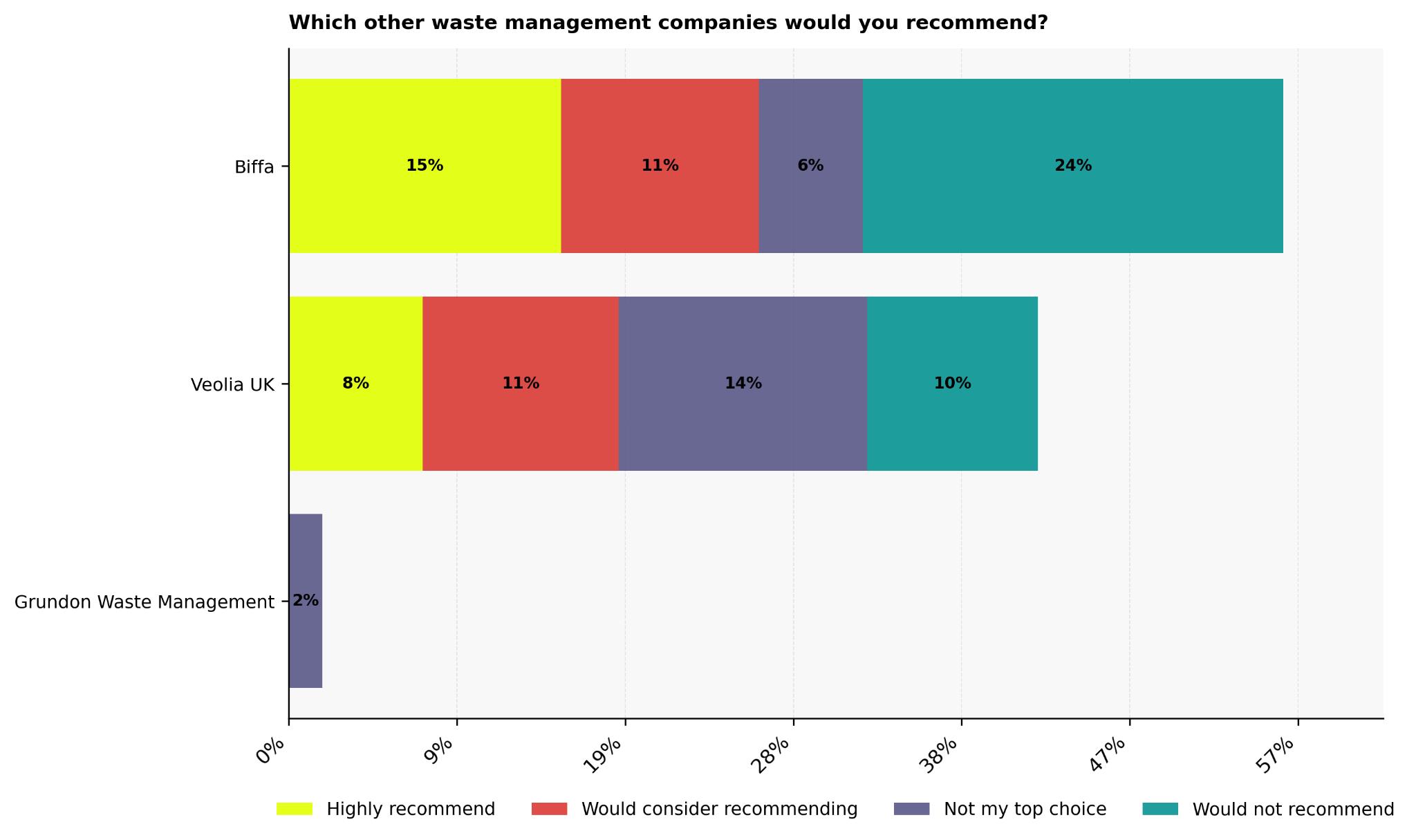 Veolia UK sits in the middle. While 8% highly recommend and 11% would consider recommending it, 14% list it as not their top choice, and 10% would not recommend it, indicating steady but unremarkable performance for many users.