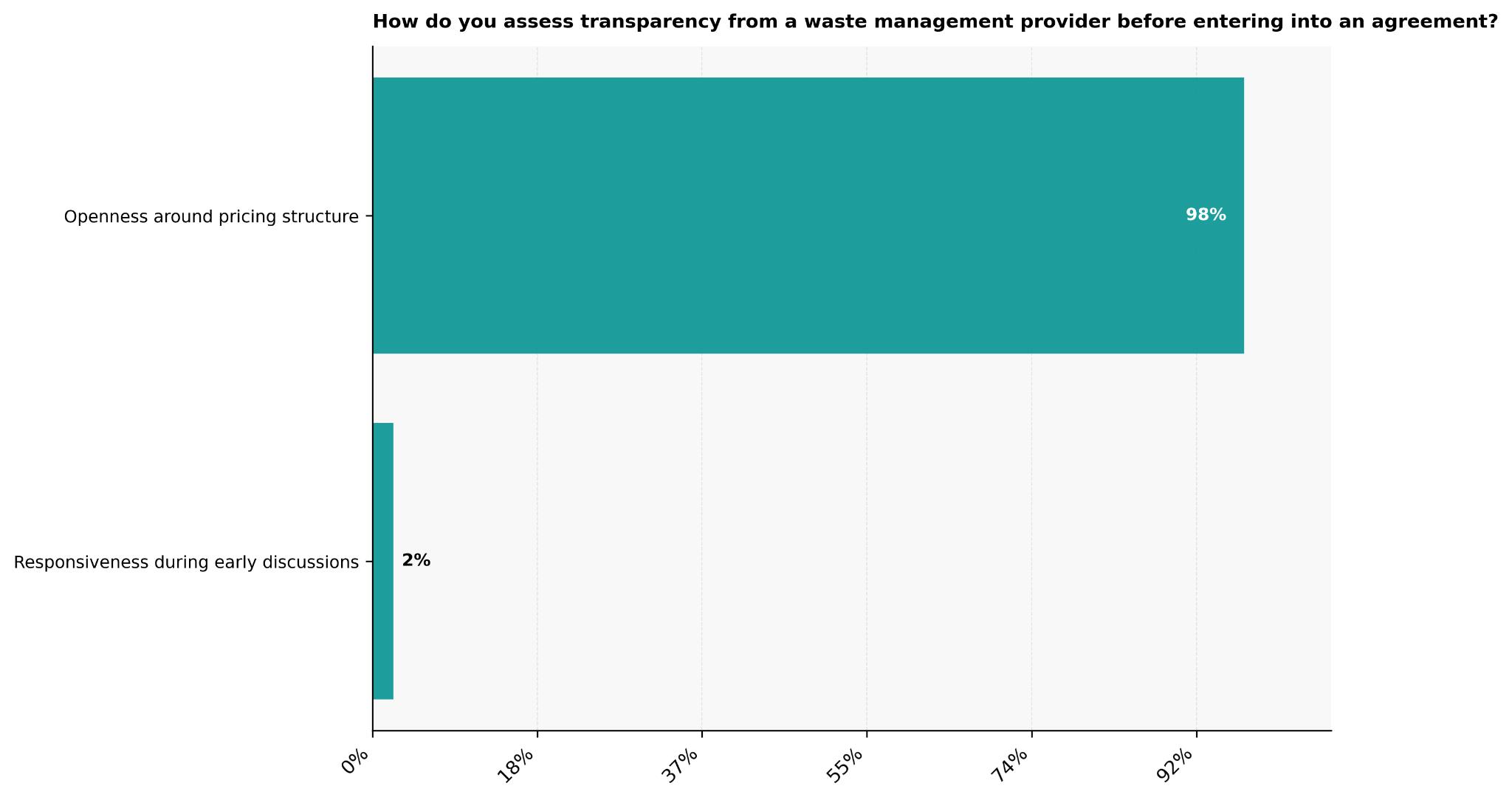 By contrast, only 2% assess transparency primarily through responsiveness during early discussions, suggesting that speed of reply carries little weight without clear financial clarity from the outset.
