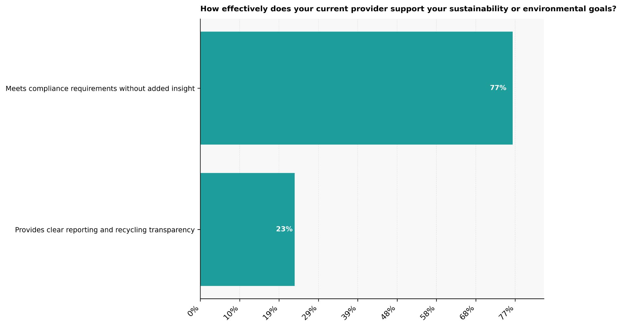 The effectiveness of current providers in supporting the sustainability or environmental goals of business leaders who use waste management services falls into two clear camps. For 77%, providers meet compliance requirements but offer little additional insight.