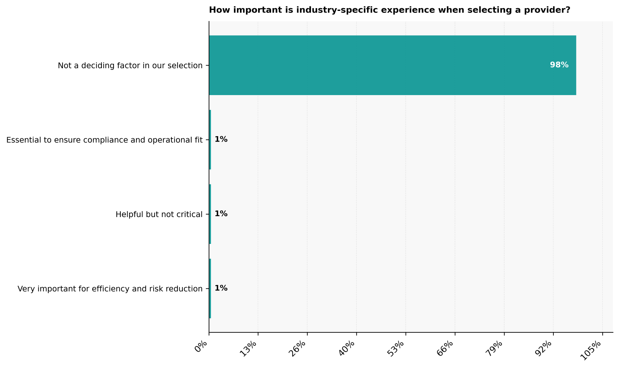 Only small groups attach added value to specialism. For 1%, industry experience is essential to ensure compliance and operational fit, typically where regulations are tighter or waste streams are more complex. Another 1% see it as helpful but not critical, often where internal controls already manage most risks. A further 1% value specialist knowledge for efficiency and risk reduction, usually in higher-volume or technically demanding environments.