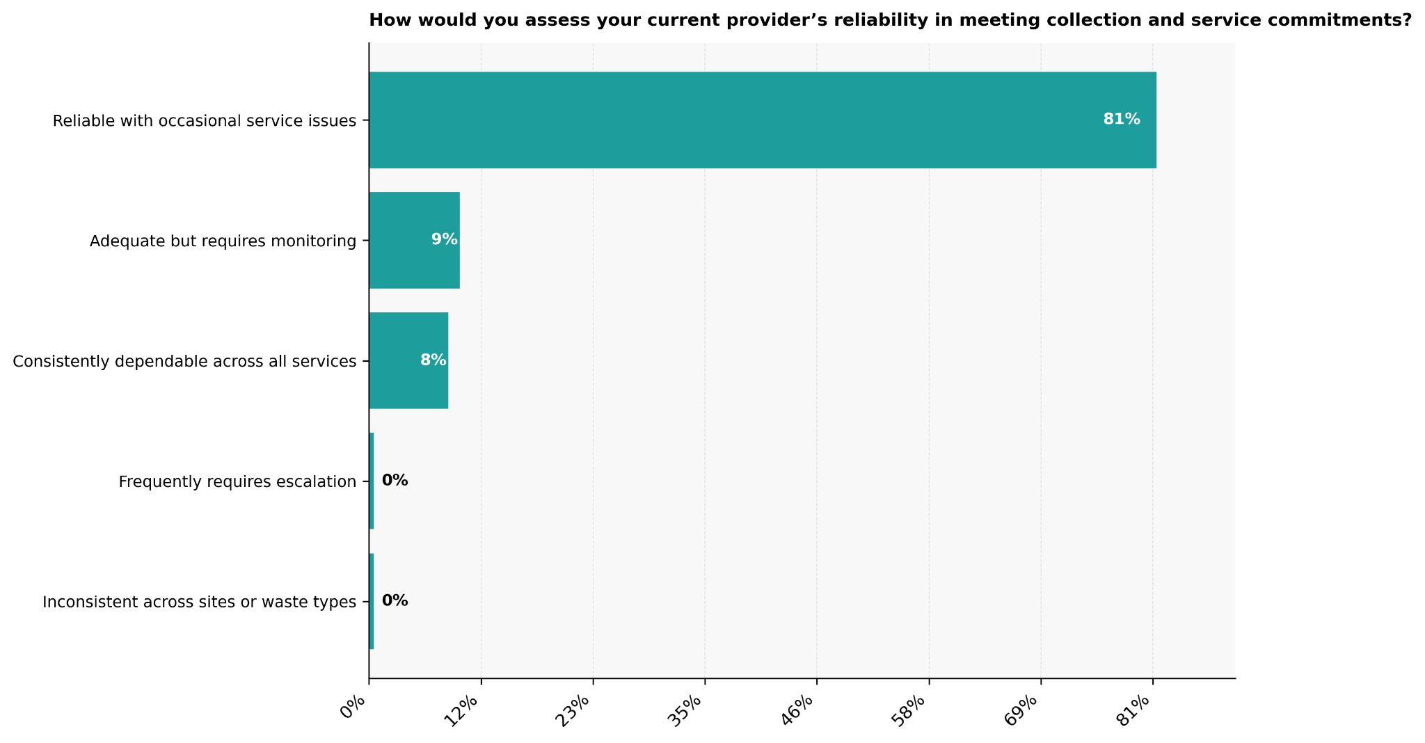Another 9% rate service as adequate but requiring monitoring, often because service levels can drift over time without regular check-ins. A further 8% report consistently dependable delivery across all services, pointing to providers with strong planning, scheduling, and communication systems.