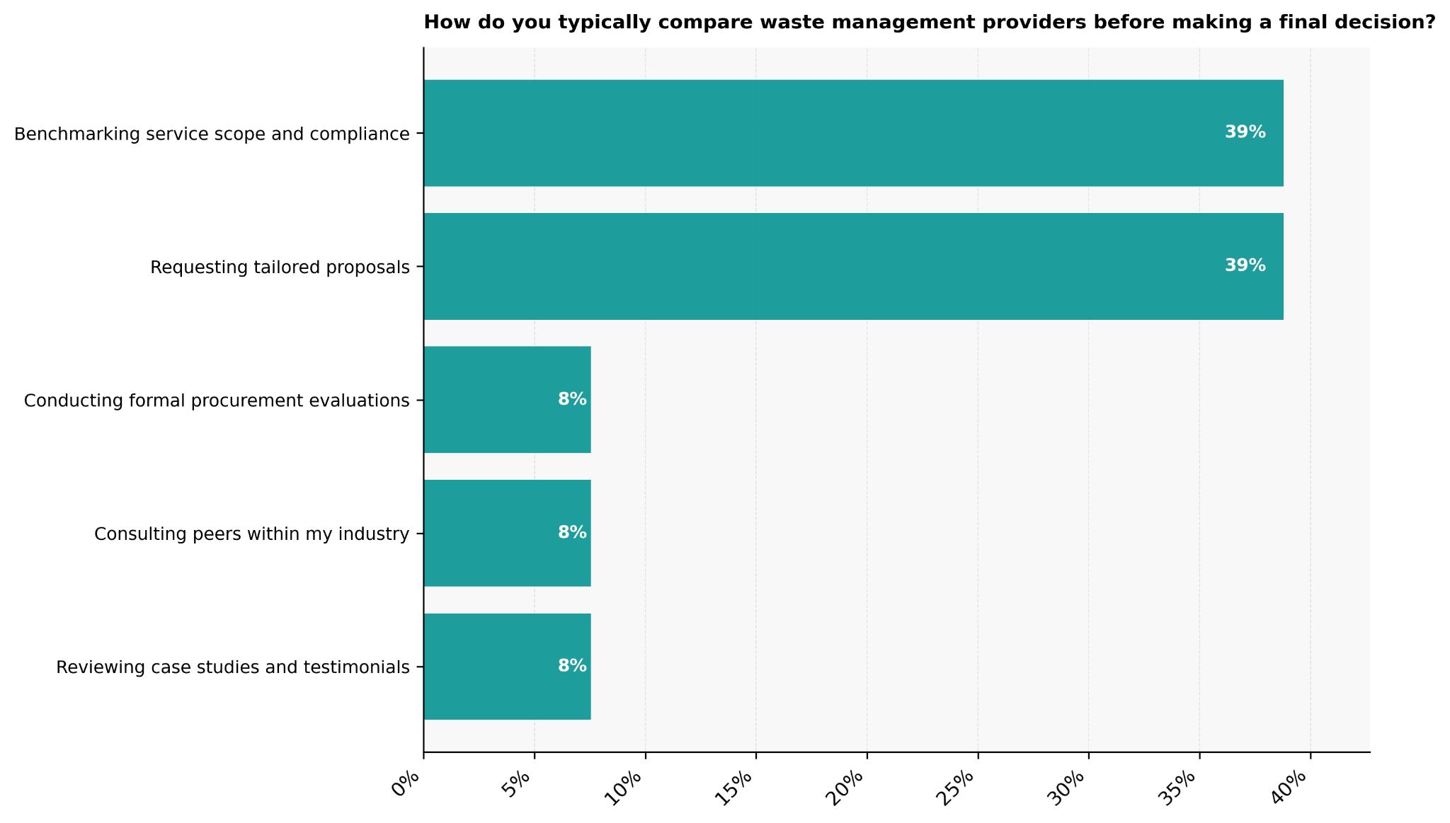 How business leaders who use waste management services typically compare providers before making a final decision centres on practical validation. Benchmarking service scope and compliance leads at 39%, as many buyers first check coverage, licensing, and regulatory alignment before anything else. An equal 39% request tailored proposals, wanting to see how pricing, collection frequency, reporting, and sustainability targets are adapted to their operating environment.