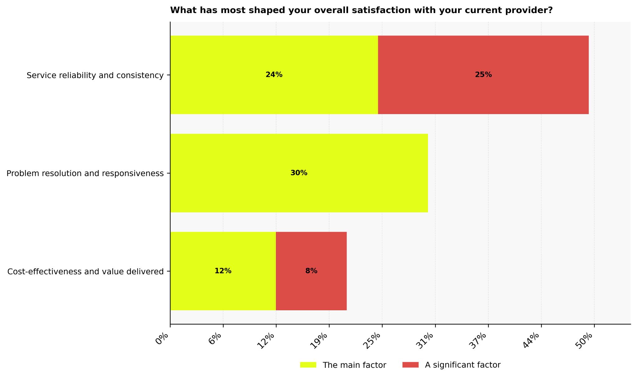 What shapes overall satisfaction with a current provider for business leaders who use waste management services is driven mainly by how well issues are handled and how reliably services are delivered. Problem resolution and responsiveness lead as the main factor for 30%, showing that fast, practical responses to missed collections, billing queries, or scheduling problems leave a lasting impression.