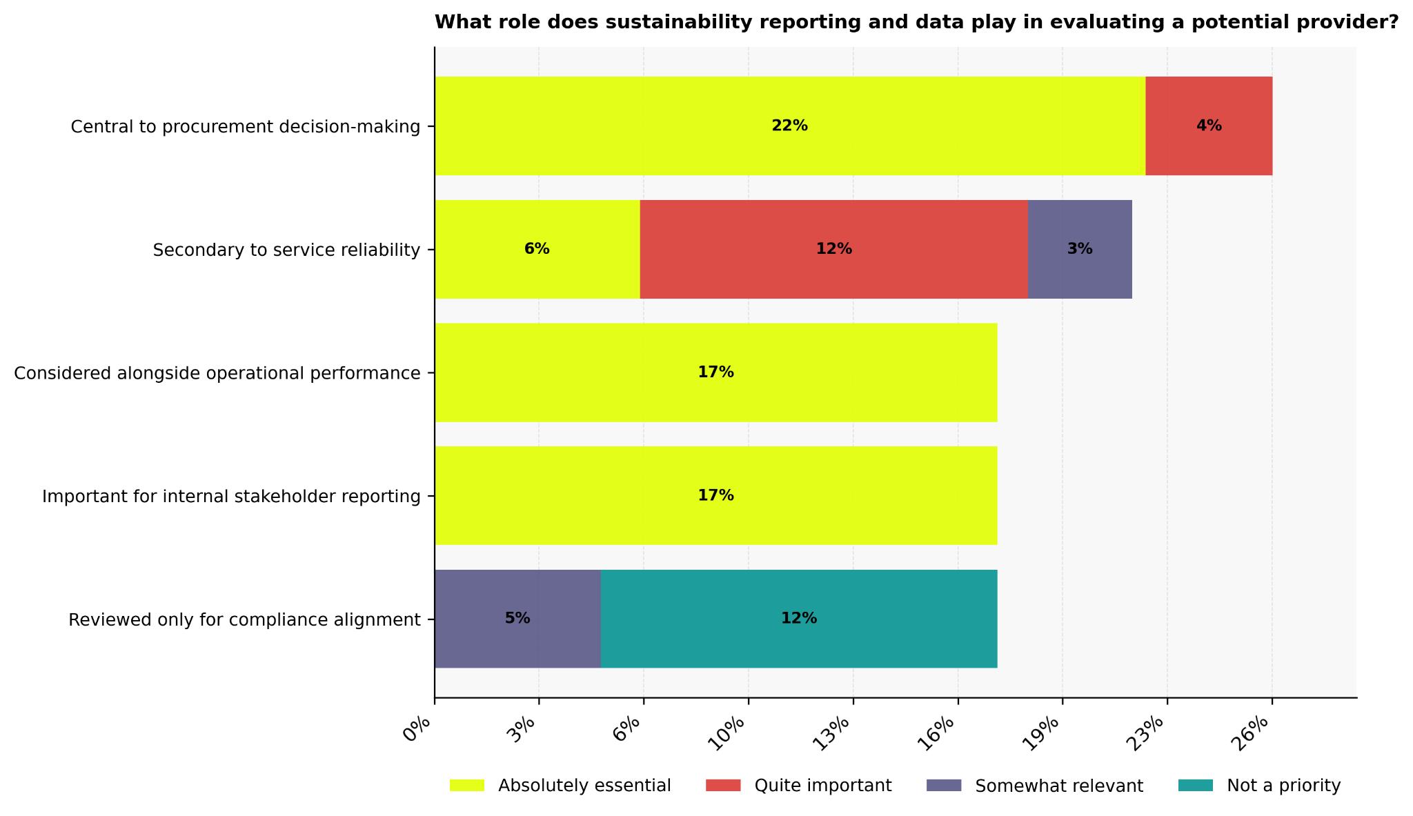 The role sustainability reporting and data play in evaluating a potential provider varies sharply among business leaders. For 26% of our audience, it sits at the centre of procurement decisions, with 22% calling it absolutely essential and 4% quite important, often linked to investor scrutiny, regulatory exposure, and reputational risk.