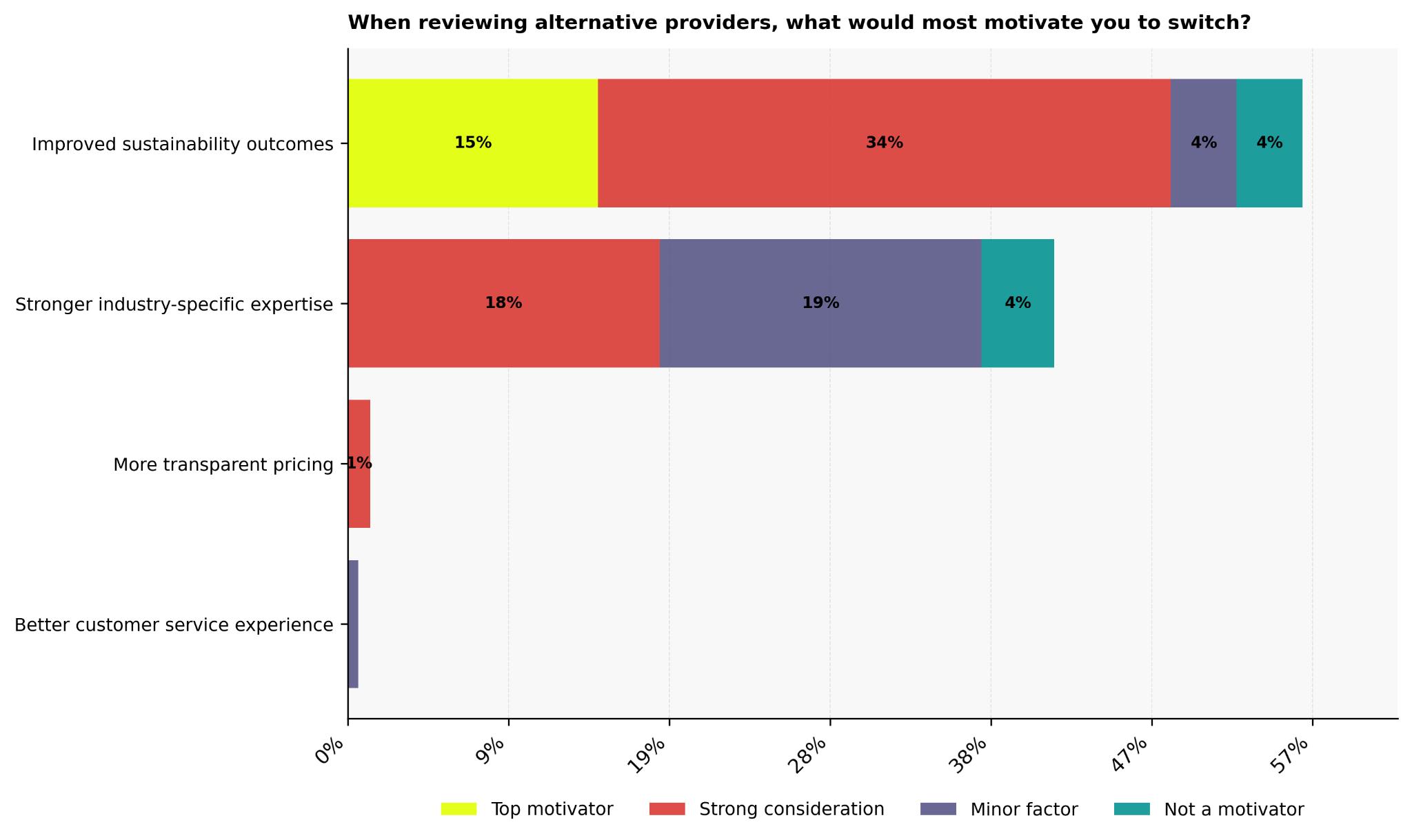 Stronger industry-specific expertise also carries real pull, with 18% treating it as a strong consideration, 19% as a minor factor, and only 4% saying it is not a motivator, suggesting many buyers see specialist know-how as a worthwhile upgrade when service needs become more complex.