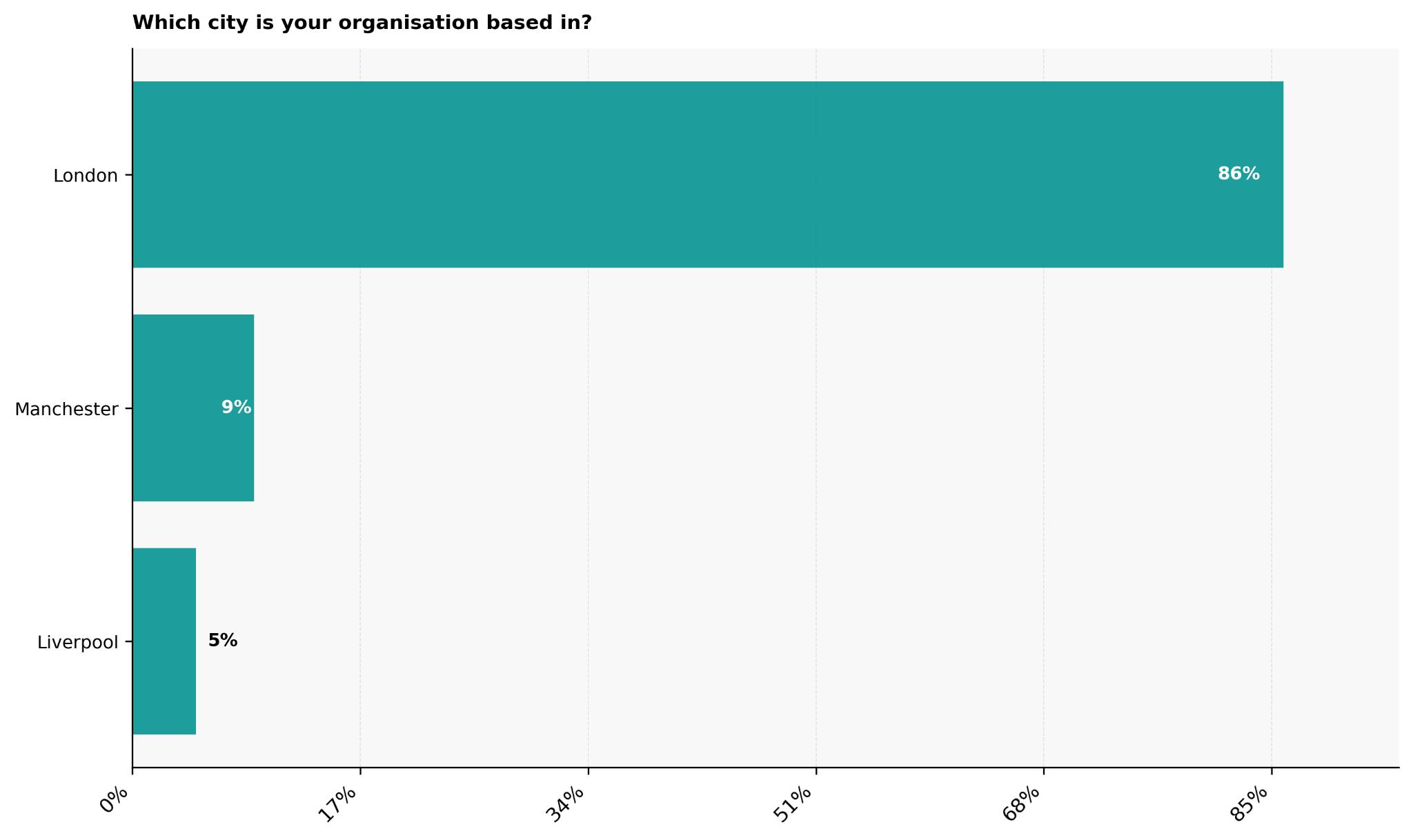 Manchester accounts for 9% and Liverpool for 5%, both of which make sense as large regional hubs.