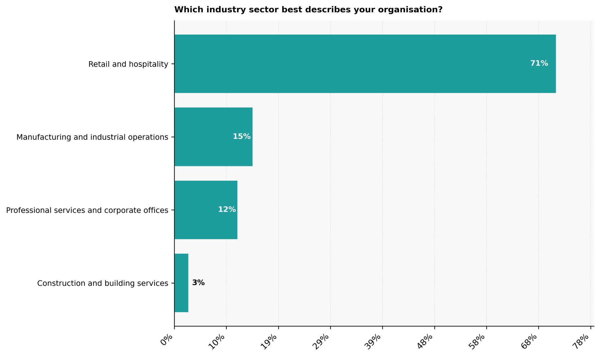 Manufacturing and industrial operations follow at 15%, closely mirroring the roughly 16% of UK food waste generated through processing and production activity. Professional services and corporate offices at 12% point to growing emphasis on recycling targets and environmental reporting, while construction and building services at 3% suggest more project-based, time-bound waste requirements.